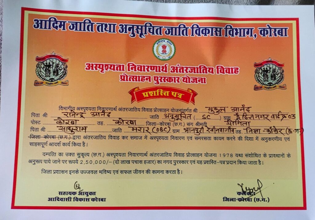 कार्यालय सहायक आयुक्त आदिवासी विकास विभाग से प्राप्त जानकारी के अनुसार राजेन्द्र आनंद पिता मुकुल आनंद, अनुसूचित जाति, निवासी इंदिरा नगर वार्ड क्रमांक 03 जिला कोरबा तथा योगिता पिता साधुराम, जाति मरार (अन्य पिछड़ा वर्ग), निवासी कांकेर के मध्य संपन्न अंतरजातीय विवाह को शासन की योजना के अंतर्गत मान्यता दी गई। विवाह उपरांत छत्तीसगढ़ शासन के आदिम जाति तथा अनुसूचित जाति विकास विभाग द्वारा संचालित अस्पृश्यता निवारणार्थ अंतरजातीय विवाह प्रोत्साहन पुरस्कार योजना के अंतर्गत दंपत्ति को कुल 2 लाख 50 हजार रुपये की प्रोत्साहन राशि स्वीकृत की गई है।