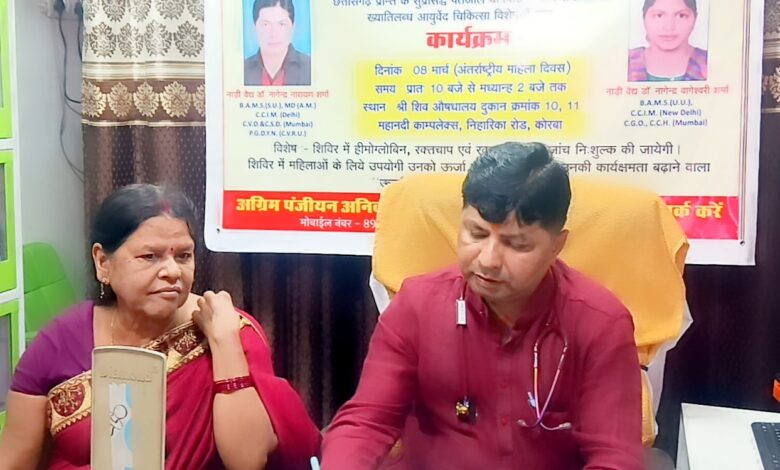 अंतरराष्ट्रीय महिला दिवस पर कोरबा में निःशुल्क आयुर्वेद-योग चिकित्सा शिविर, 54 मरीज हुए लाभान्वित