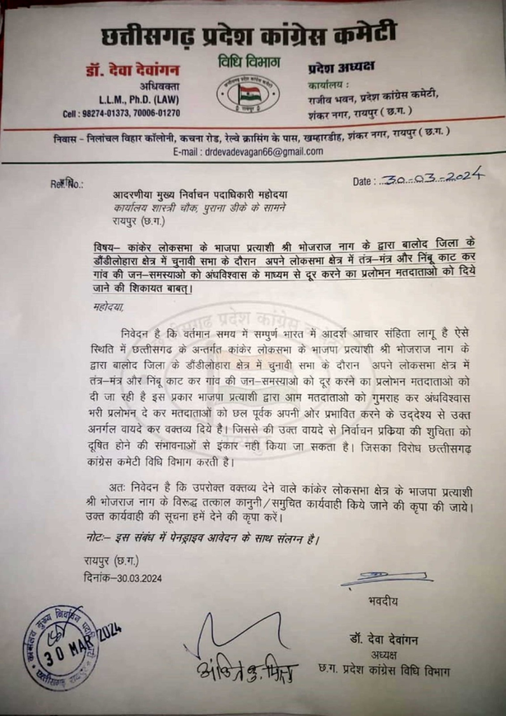 रायपुर/30 मार्च 2024। कांकेर लोकसभा के भाजपा प्रत्याशी भोजराज नाग के द्वारा बालोद जिला के डौंडीलोहारा क्षेत्र में चुनावी सभा के दौरान अपने लोकसभा क्षेत्र में तंत्र-मंत्र और नींबू काट कर गांव की जन-समस्याओं को अंधविश्वास के माध्यम से दूर करने का प्रलोभन मतदाताओं को दिये जाने की शिकायत कांग्रेस ने मुख्य चुनाव आयुक्त से किया।