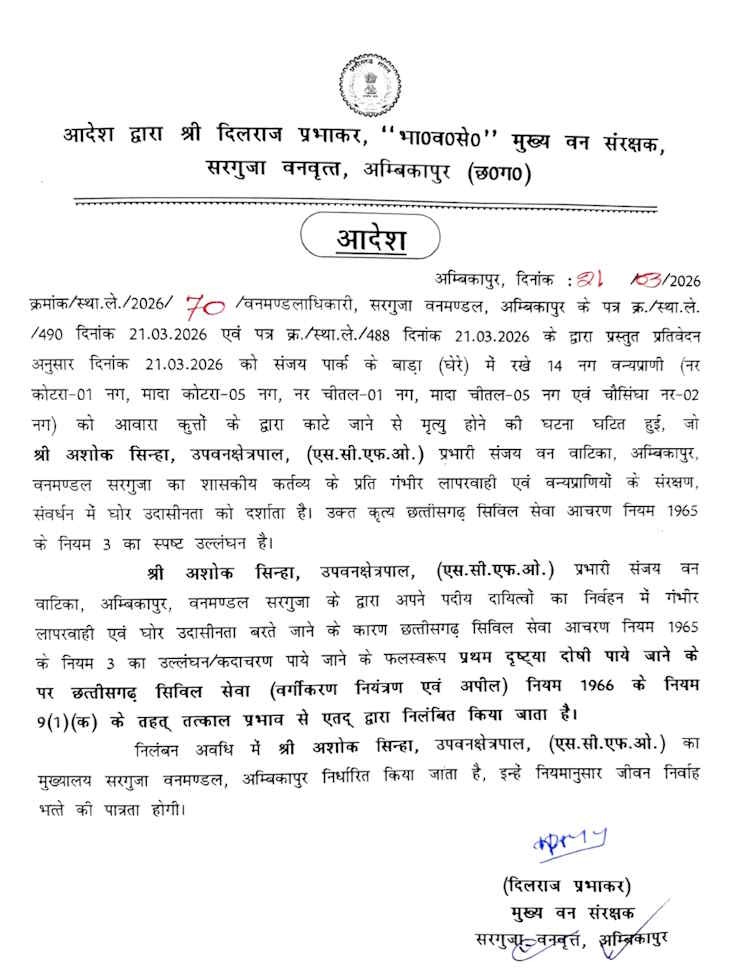 जारी आदेश के अनुसार, उपवनक्षेत्रपाल (एससीएफओ) एवं प्रभारी अशोक सिन्हा, वनपाल सहायक ममता परते, वनपाल प्रतिमा लकड़ा और वनपाल बिन्दु सिंह को छत्तीसगढ़ सिविल सेवा आचरण नियम 1965 के तहत निलंबित किया गया है। निलंबन अवधि के दौरान इनका मुख्यालय सरगुजा वनमंडल, अंबिकापुर निर्धारित किया गया है।