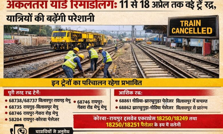 अकलतरा यार्ड रिमॉडलिंग: 11 से 18 अप्रैल तक कई ट्रेनें रद्द, यात्रियों की बढ़ेगी परेशानी