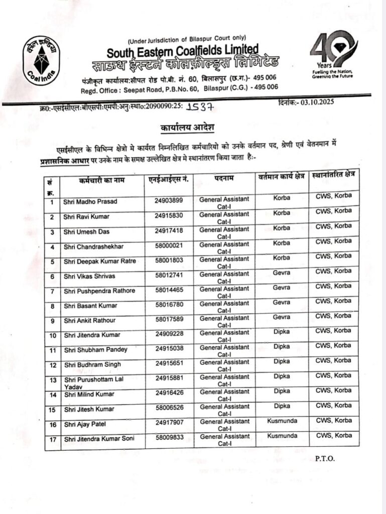एसईसीएल प्रबंधन ने स्पष्ट किया है कि यह स्थानांतरण पूरी तरह प्रशासनिक आधार पर किया गया है।