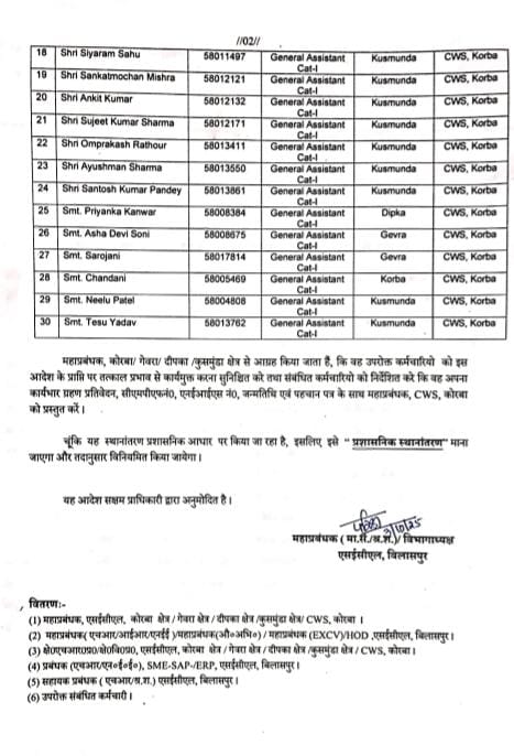 महाप्रबंधकों को निर्देशित किया गया है कि वे संबंधित कर्मचारियों को तत्काल कार्यमुक्त कर सीडब्ल्यूएस, कोरबा में कार्यभार ग्रहण करने भेजें। कर्मचारियों को अपने दस्तावेजों के साथ कार्यभार ग्रहण प्रतिवेदन प्रस्तुत करना होगा।