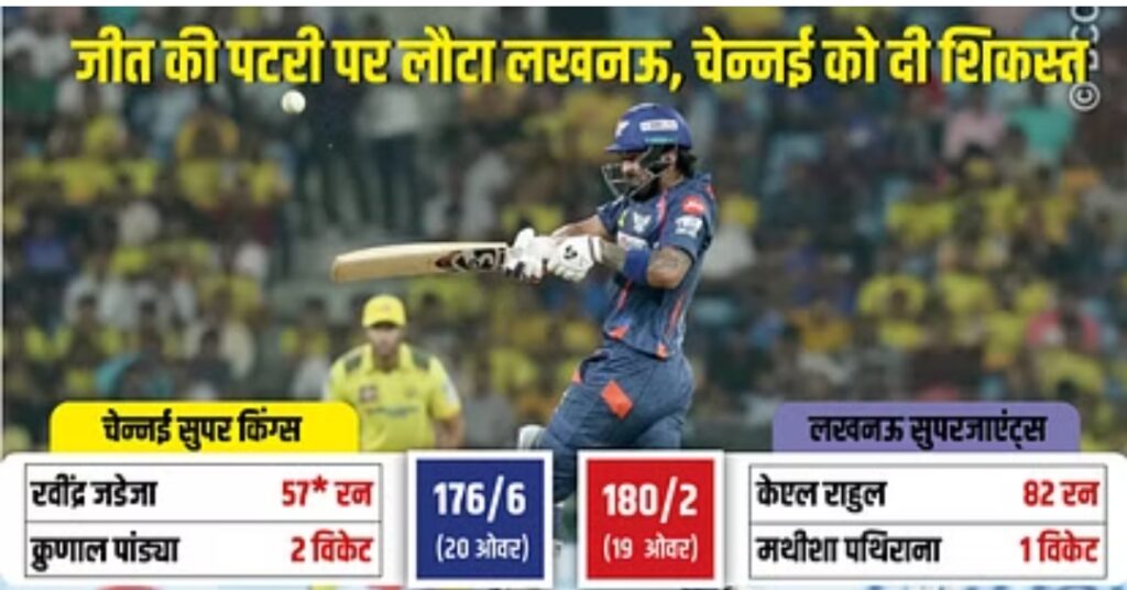 लखनऊ : लखनऊ सुपरजाएंट्स के कप्तान केएल राहुल और क्विंटन डिकॉक ने चेन्नई सुपर किंग्स (सीएसके) के खिलाफ शानदार बल्लेबाजी की और पांच बार की चैंपियन टीम को अपने होम ग्राउंड पर चित्त कर दिया। दोनों बल्लेबाजों के बीच पहले विकेट के लिए हुई शतकीय साझेदारी के दम पर लखनऊ सुपरजाएंट्स ने चेन्नई सुपर किंग्स को आठ विकेट से हराया। लखनऊ को पिछले दो मुकाबलों में हार का सामना करना पड़ा था, लेकिन टीम जीत की पटरी पर लौटने में सफल रही।