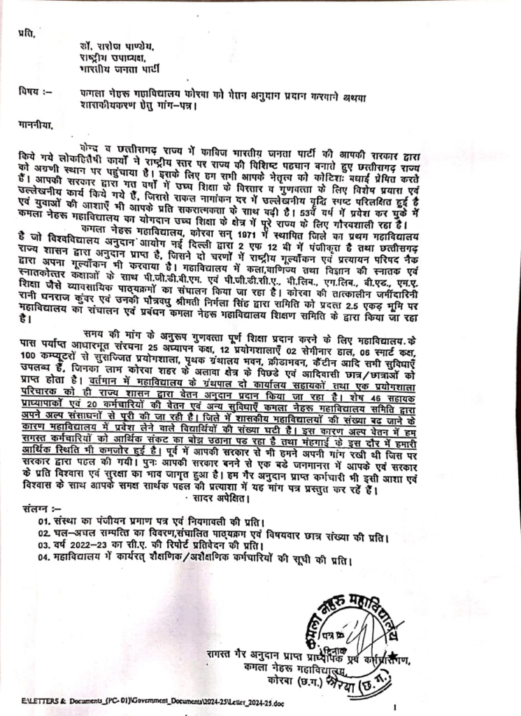 कोरबा, कमला नेहरू महाविद्यालय के शिक्षको को मिल रहे अल्प वेतन को लेकर भारतीय जनता पार्टी की राष्ट्रीय उपाध्यक्ष, पूर्व सांसद डॉ. सरोज पांडे, को ज्ञापन सौंपा सह मांग पत्र सौंपा है जिसमे वेतन वृद्धि या शासकीय कारण करने की मांग रखी है |