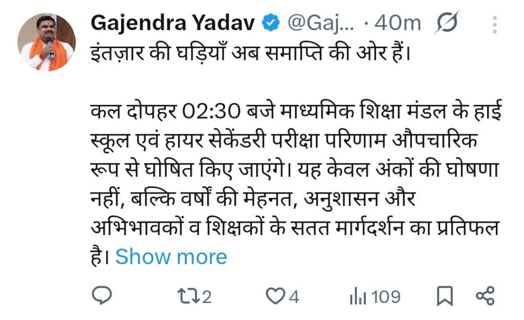 शिक्षा मंत्री गजेंद्र यादव ने विद्यार्थियों को शुभकामनाएं देते हुए कहा कि सभी छात्र सकारात्मक सोच के साथ अपना परिणाम देखें। उन्होंने यह भी कहा कि परीक्षा जीवन का एक हिस्सा है और आगे बढ़ने के कई अवसर हमेशा खुले रहते हैं।