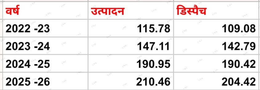 कैप्टिव और कमर्शियल माइनिंग ने वित्तीय वर्ष 2025-26 में उत्पादन के नए आयाम छूते हुए 210.46 मिलियन टन (एमटी) कोयला उत्पादन दर्ज किया है। यह आंकड़ा पिछले वर्ष की तुलना में करीब 20 एमटी अधिक है। इसी अवधि में 204.42 एमटी कोयले का डिस्पैच भी किया गया, जो बीते वर्ष से 14 एमटी ज्यादा है।