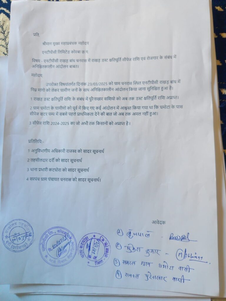 उन्होंने एनटीपीसी प्रशासन से प्रदूषण की समस्या का समाधान करने और उन्हें मुआवजा देने की मांग की है। धनरास निवासी बृजपाल खुटी ने बताया कि 10 दिन पहले ही आंदोलन की चेतावनी दी गई थी। ग्रामीणों को एक साल से राखड़ धूल क्षतिपूर्ति नहीं मिली है। स्थानीय लोगों को नौकरी में प्राथमिकता देने का वादा भी पूरा नहीं हुआ है। एनटीपीसी प्रशासन ने अभी तक इस मामले पर कोई प्रतिक्रिया नहीं दी है।