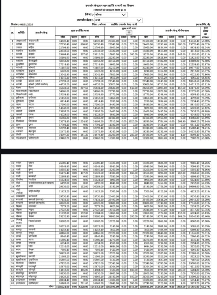 कोरबा, 11 जनवरी। आकांक्षी जिला कोरबा में चालू खरीफ विपणन वर्ष 2025-26 के तहत धान खरीदी अभियान गंभीर अव्यवस्थाओं का शिकार होता नजर आ रहा है। एक ओर जहां लगभग दो माह की अवधि बीत जाने के बाद भी जिले में निर्धारित लक्ष्य का करीब आधा ही धान खरीदा जा सका है, वहीं दूसरी ओर समर्थन मूल्य पर खरीदा गया सवा सौ करोड़ रुपये से अधिक मूल्य का साढ़े पांच लाख क्विंटल से ज्यादा धान उपार्जन केंद्रों में जाम पड़ा हुआ है। इसके बावजूद मार्कफेड द्वारा कोरिया, सरगुजा, बेमेतरा और जीपीएम जैसे पड़ोसी जिलों में खरीदे गए सवा आठ लाख क्विंटल से अधिक धान के कस्टम मिलिंग के लिए कोरबा के राइस मिलरों को ऑनलाइन डीओ जारी कर दिया गया है। इस स्थिति ने जिले की 41 सहकारी समितियों और 65 उपार्जन केंद्रों के कर्मचारियों की चिंता बढ़ा दी है।