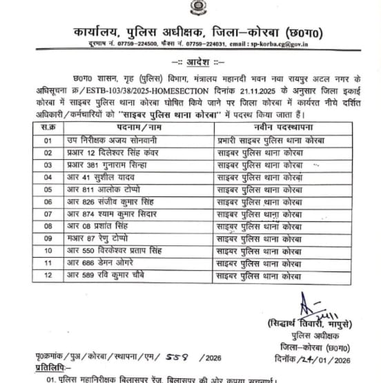 इस संबंध में पुलिस अधीक्षक सिद्धार्थ तिवारी द्वारा आदेश जारी किया गया है। यह कार्रवाई गृह (पुलिस) विभाग, छत्तीसगढ़ शासन की अधिसूचना दिनांक 21 नवंबर 2025 के तहत की गई है। जारी आदेश के अनुसार साइबर पुलिस थाना कोरबा में कुल 12 अधिकारियों एवं कर्मचारियों की पदस्थापना की गई है।