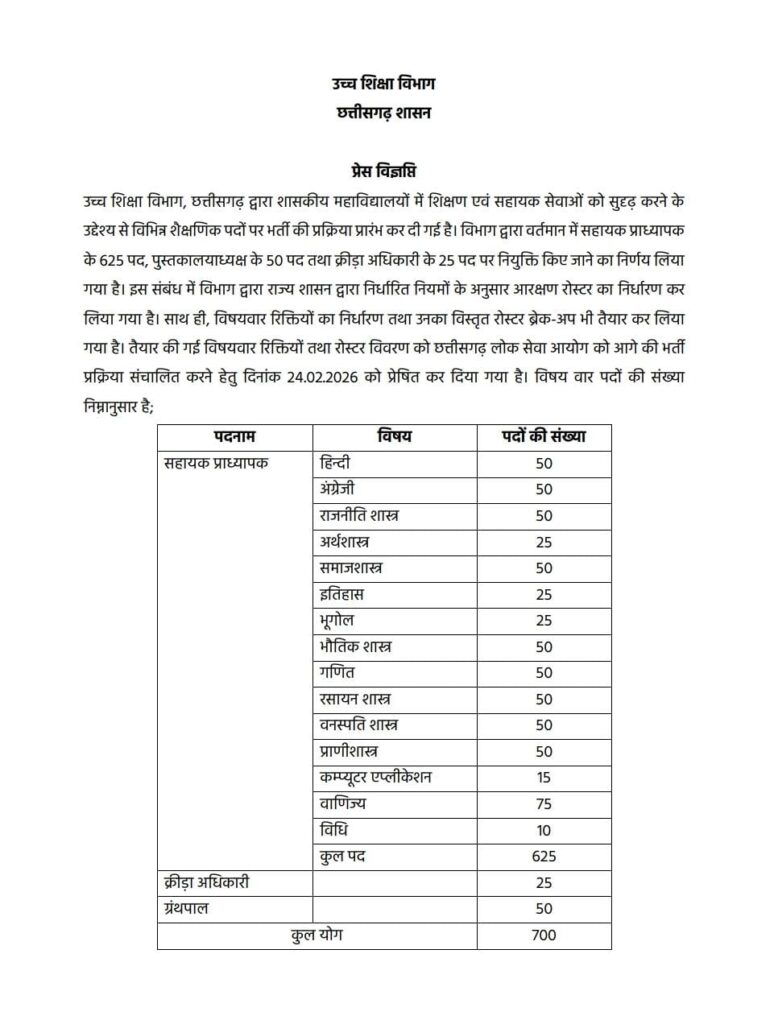 रायपुर, 13 मार्च 2026। मुख्यमंत्री विष्णु देव साय की विशेष पहल पर राज्य के शासकीय महाविद्यालयों में शिक्षण एवं सहायक सेवाओं को सुदृढ़ बनाने के उद्देश्य से उच्च शिक्षा विभाग द्वारा विभिन्न शैक्षणिक पदों पर भर्ती की प्रक्रिया प्रारंभ कर दी गई है। विभाग द्वारा सहायक प्राध्यापक के 625 पद, ग्रंथपाल के 50 पद तथा क्रीड़ा अधिकारी के 25 पदों सहित कुल 700 पदों पर भर्ती की जाएगी।