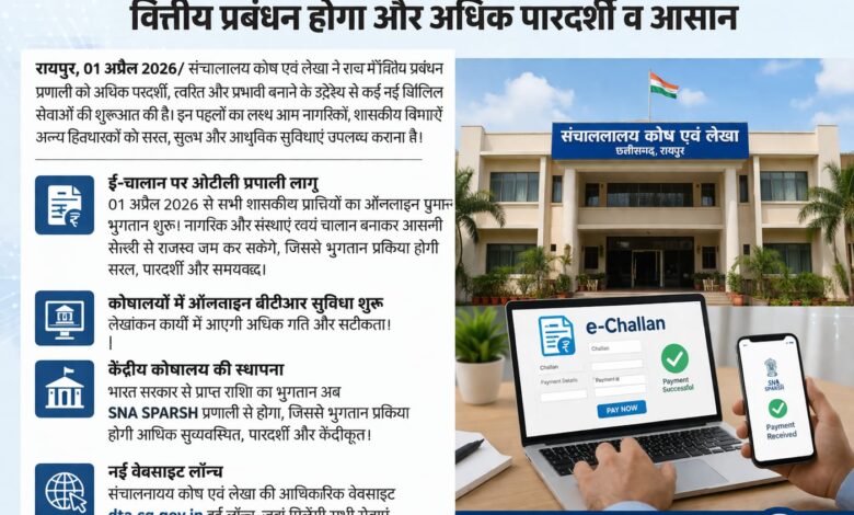 रायपुर, 01 अप्रैल 2026। राज्य में वित्तीय व्यवस्थाओं को अधिक पारदर्शी, त्वरित और प्रभावी बनाने की दिशा में संचालनालय कोष एवं लेखा ने कई नई डिजिटल सेवाओं की शुरुआत की है। इन पहलों का उद्देश्य आम नागरिकों, शासकीय विभागों और अन्य हितधारकों को सरल, सुलभ और आधुनिक सुविधाएं उपलब्ध कराना है।