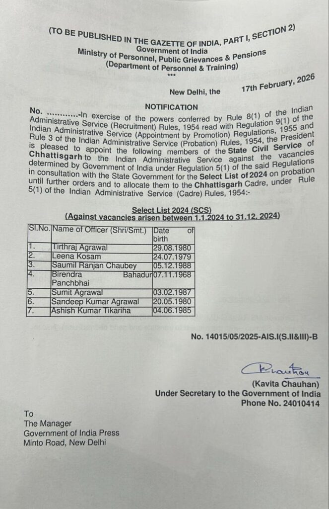 छत्तीसगढ़: राज्य प्रशासनिक सेवा के 7 अफसर बने IAS, केंद्र सरकार ने जारी की अधिसूचना, 2024 की चयन सूची के तहत मिला प्रमोशन