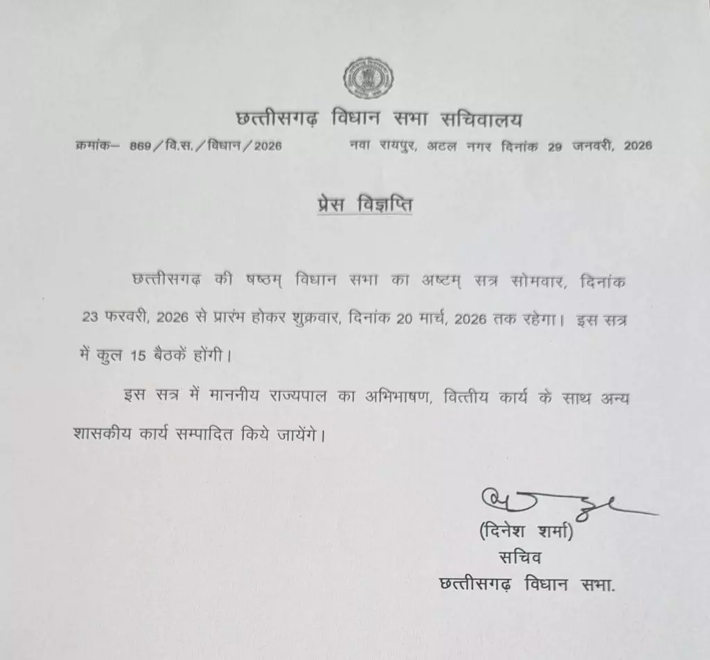 छत्तीसगढ़ विधानसभा का बजट सत्र 23 फरवरी से, 20 मार्च तक चलेगी कार्यवाही