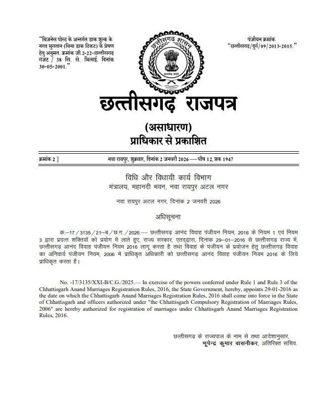 महानदी भवन, नवा रायपुर द्वारा जारी अधिसूचना के अनुसार, ‘छत्तीसगढ़ आनंद विवाह पंजीयन नियम, 2016’ की शक्तियों का प्रयोग करते हुए राज्य सरकार ने यह स्पष्ट किया है कि प्रदेश में अब विवाह का पंजीकरण कराना कानूनी रूप से जरूरी होगा।