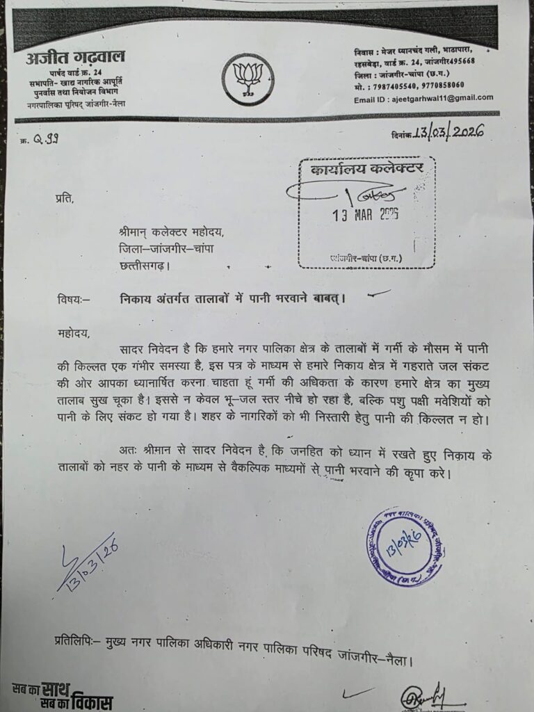 जांजगीर-नैला नगर पालिका क्षेत्र के तालाबों में पानी भरवाने पार्षद अजीत गढ़वाल ने कलेक्टर को लिखा पत्र