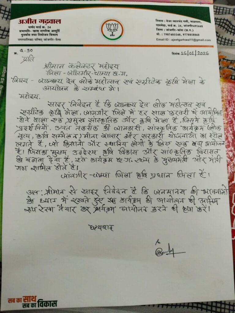 जांजगीर-चांपा, 16 जनवरी। जिले में प्रतिवर्ष आयोजित होने वाले बहुप्रतीक्षित जाज्वल्य देव लोक महोत्सव एवं एग्रीटेक कृषि मेला के आयोजन को लेकर वार्ड क्रमांक 24 के पार्षद अजीत गढ़वाल ने जिला कलेक्टर जन्मेजय महोबे को पत्र लिखकर समयबद्ध एवं सुव्यवस्थित आयोजन की मांग की है। पार्षद ने अपने पत्र में इस आयोजन के सांस्कृतिक, सामाजिक एवं कृषि महत्व को रेखांकित करते हुए जनभावनाओं को ध्यान में रखने का आग्रह किया है।