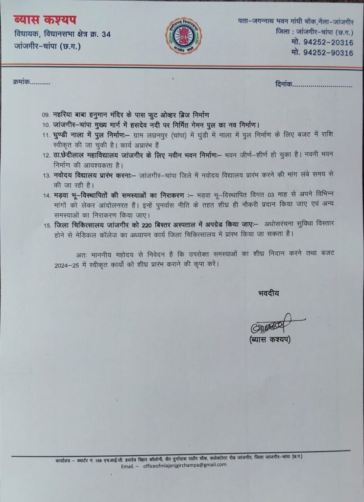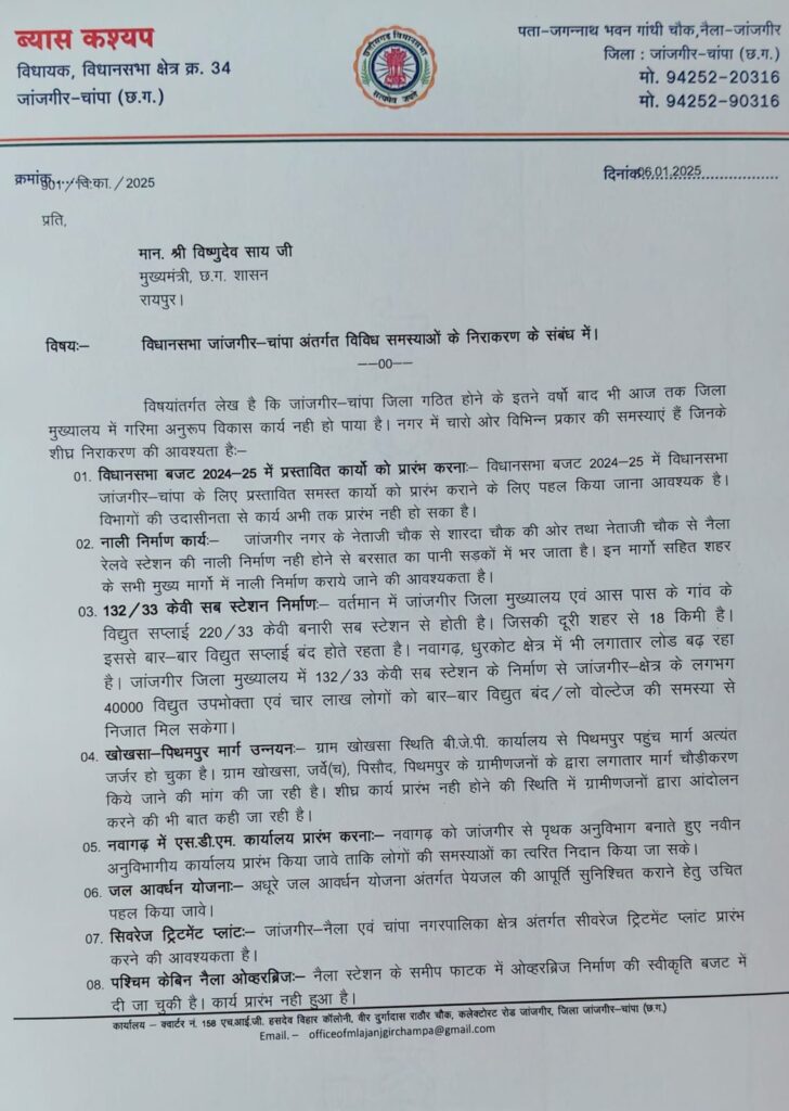 विधायक ब्यास कश्यप ने जांजगीर जिले की विभिन्न समस्याओं को लेकर मुख्यमंत्री को सौपा ज्ञापन