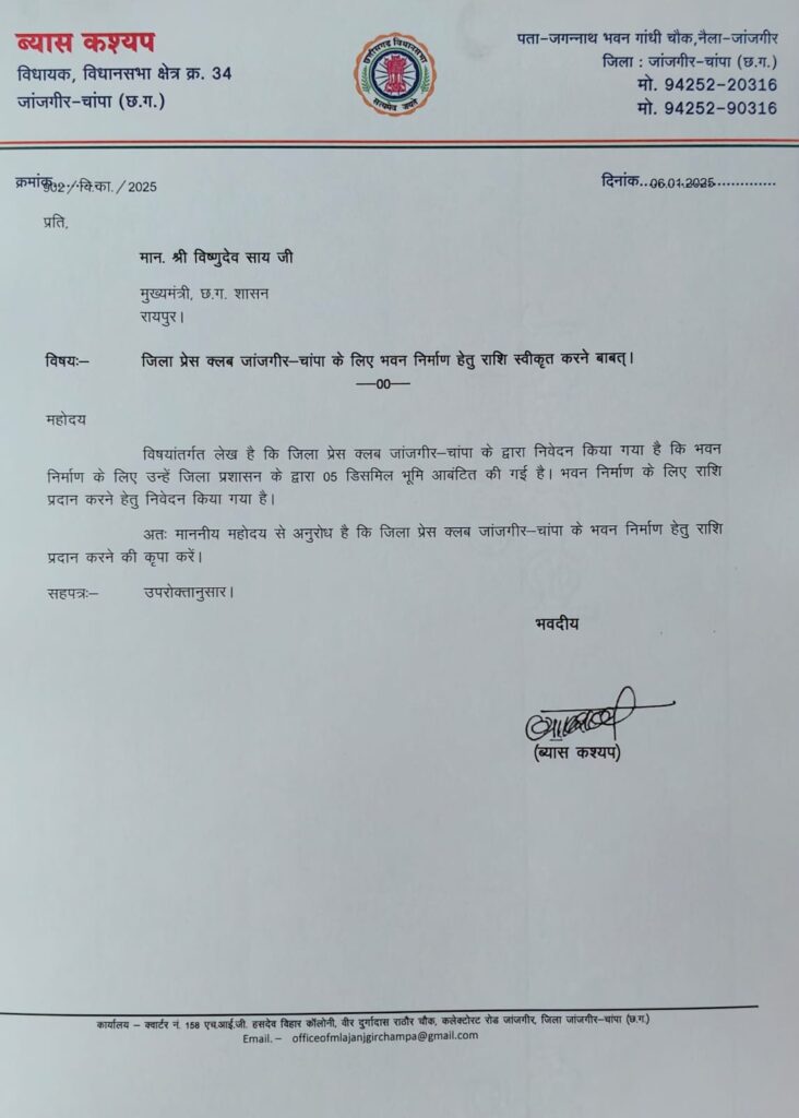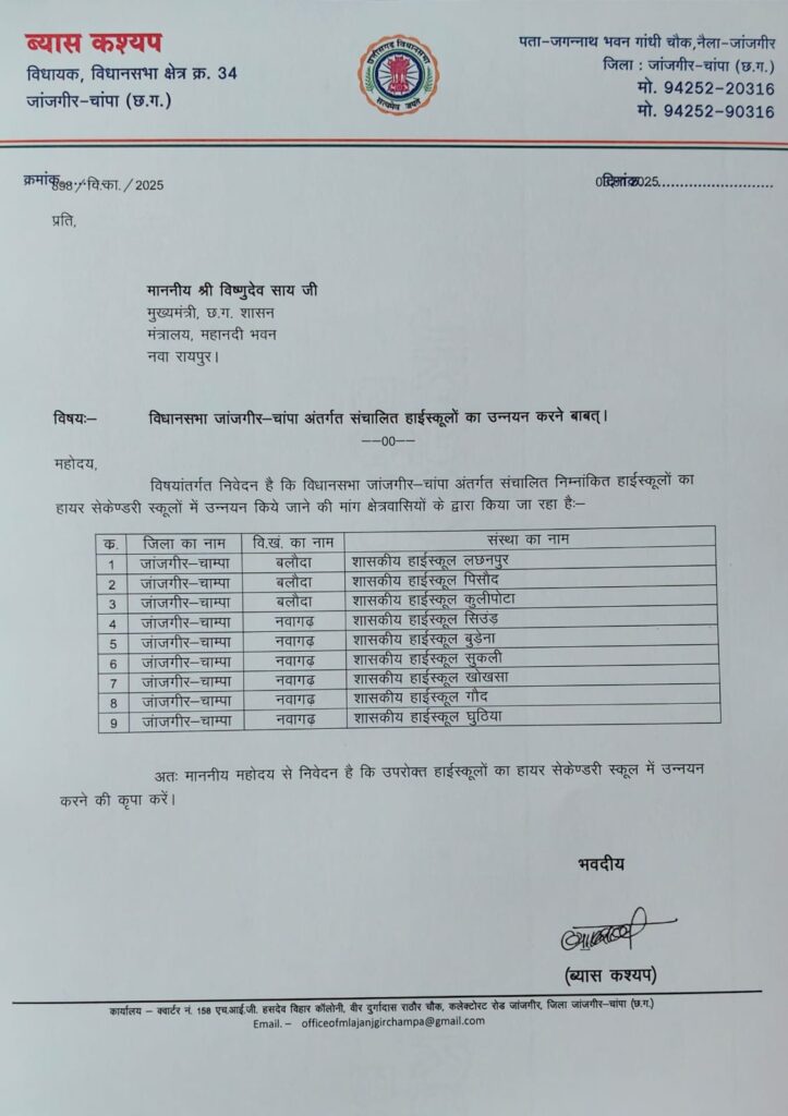 इसके अलावा उन्होंने जिला प्रेस क्लब के भवन निर्माण हेतु राशि प्रदान करने के लिए भी मुख्यमंत्री को पत्र लिखा है। ब्यास कश्यप ने विधानसभा जांजगीर-चांपा अंतर्गत संचालित हाईस्कूलों को हायर सेकेण्डरी स्कूलों में उन्नयन करने के लिए भी ज्ञापन सौपा है। इसमें प्रमुख रूप से शासकीय हाईस्कूल लछनपुर, पिसौद, कुलीपोटा, सिउंड़, बुड़ेना, सुकली, खोखसा, गौद एवं घुठिया के स्कूल शामिल हैं। इन स्कूलों के हायर सेकेण्डरी में उन्नयन हो जाने से ग्राम के बच्चों को स्थानीय स्तर उच्च शिक्षा का लाभ मिल सकेगा।