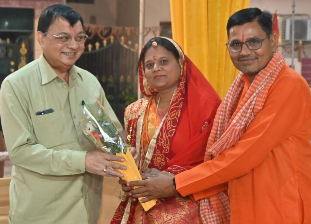 जहां कथाव्यास पं० नरेश तिवारी (लाखासर वाले) ने दुपट्टा ओढ़ाकर और कथा के मुख्य यजमान श्रीमति श्वेता देवेन्द्र तिवारी ने पुष्पगुच्छ भेंटकर उनका स्वागत किया। यहां उन्होंने समिति की मांग पर छत निर्माण हेतु दस लाख रूपये एवं कार्यक्रम हेतु पच्चीस हज़ार रूपये अनुदान की सहर्ष घोषणा की।