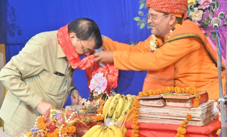 देवी भागवत कथा श्रवण करने पहुंचे कैबिनेट मंत्री लखन लाल देवांगन