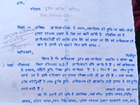 जिले की जतारा जनपद के ग्राम पंचायत नादिया के दो दर्जन से ज्यादा आदिवासी किसान सोमवार शाम 5 बजे कलेक्ट्रेट कार्यालय पहुंचे। उन्होंने गांव के पूर्व सरपंच के परिजनों पर पुश्तैनी जमीन पर अतिक्रमण के आरोप लगाकर शिकायत दर्ज कराई। कलेक्टर के नाम ज्ञापन सौंपने के बाद आदिवासियों ने एसपी दफ्तर में भी शिकायत दर्ज कराई है।