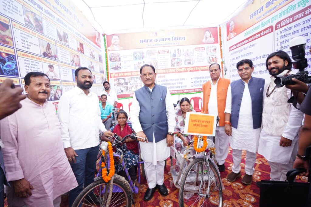 सामग्री एवं चेक वितरण – मुख्यमंत्री विष्णु देव साय ने विभागों द्वारा लगाए गए स्टॉल का अवलोकन किया। इस दौरान उन्होंने करीब 60 हितग्राहियो को विभिन्न योजना अंतर्गत सामग्री एवं का चेक वितरित किया । इसमें महिला एवं बाल विकास विभाग अंतर्गत 13 समूहों को 15 लाख रुपए का चेक,मछली पालन विभाग द्वारा 6 हितग्राहियों को महाजाल व आइस बॉक्स,10 हितग्राहयों को स्वामित्व कार्ड, हम होंगे कामयाब अंतर्गत 27 युवाओं को नियुक्ति पत्र,कृषि विभाग अंतर्गत 4 हितग्राहियों को स्प्रेयर पम्प एवं समाज कल्याण विभाग द्वारा 4 दिव्यांगों को मोटराइज्ड ट्रायसिकल शामिल हैं।
