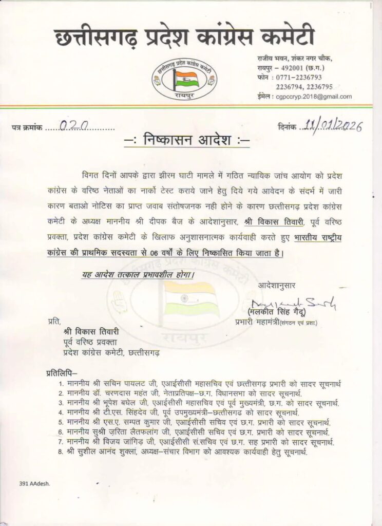 रायपुर 11 जनवरी 2026। छत्तीसगढ़ कांग्रेस ने अपने पूर्व प्रवक्ता विकास तिवारी को पार्टी की प्राथमिक सदस्यता से 6 साल के लिए निष्कासित कर दिया है। आपको बता दे विकास तिवारी ने झीरम घाटी हमले से जुड़े बयान और न्यायिक जांच आयोग को लेकर टिप्पणी की थी। तिवारी के इस बयान के बाद पार्टी ने उन्हे नोटिस जारी किया था, जिसमें संतोषजनक जवाब नही मिलने पर पार्टी ने उन्हे 6 साल के लिए पार्टी की प्राथमिक सदस्या से निष्किासित कर दिया है।