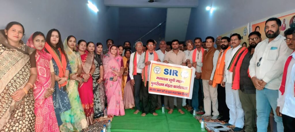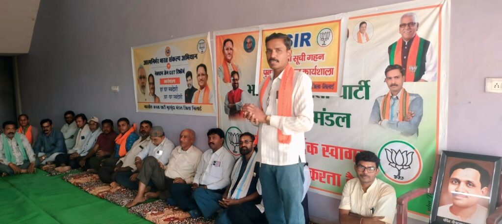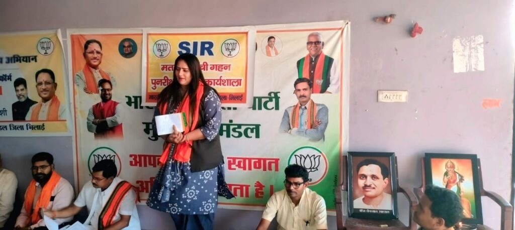 अहिवारा 08 नवंबर 2025/ भारतीय जनता पार्टी, प्रदेश संगठन के निर्देशानुसार एवं भाजपा भिलाई जिला अध्यक्ष श्री पुरुषोत्तम देवांगन जी के आदेश अनुसार मुरमुन्दा मंडल में SIR मतदाता सूची गहन पुनरीक्षण एवं राष्ट्रगीत वंदे मातरम के 150 वर्ष पूर्ण होने पर कार्यशाला का आयोजन किया गया। कार्यशाला में राष्ट्रीय गीत वंदे मातरम् के 150 वर्ष पूरा होने के उपलक्ष्य व विशेष गहन पुनरीक्षण (SIR) के विषय में चर्चा की गई।