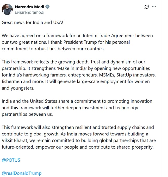 प्रधानमंत्री मोदी ने इस पहल के लिए अमेरिका के राष्ट्रपति डोनाल्ड ट्रंप के प्रति आभार व्यक्त करते हुए कहा कि भारत–अमेरिका संबंधों को मज़बूत करने के प्रति उनकी व्यक्तिगत प्रतिबद्धता सराहनीय है। उन्होंने कहा कि यह समझौता दोनों महान देशों के बीच दीर्घकालिक और मजबूत आर्थिक रिश्तों की दिशा में एक महत्वपूर्ण कदम है।