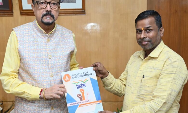 रायपुर – महामहिम राज्यपाल रमेन डेका को आज राजभवन में ‘‘सोसाइटी फॉर एम्पावरमेंट‘‘ द्वारा प्रकाशित मासिक पत्रिका ‘‘प्रारंभ‘‘ की प्रति भेंट की गई। विशेष पिछड़ी जनजातियों पर केंद्रित इस विशेषांक का संपादन मानवविज्ञानी एवं राज्यपाल के उप सचिव डॉ. रूपेन्द्र कवि द्वारा किया गया है।