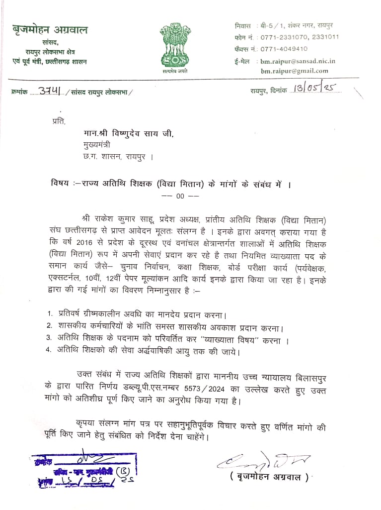 विद्या मितान शिक्षकों की मांगों पर सांसद बृजमोहन अग्रवाल ने सीएम विष्णुदेव साय को लिखा पत्र