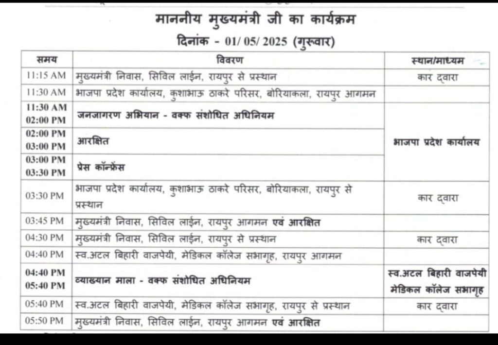 रायपुर। मुख्यमंत्री विष्णु देव साय आज 1 मई गुरुवार को राजधानी रायपुर में वक्फ संशोधन अधिनियम जनजागरण अभियान तथा व्याख्यान माला कार्यक्रम शामिल होंगे। जानकारी के अनुसार श्री साय प्रातः 11:15 बजे मुख्यमंत्री निवास सिविल लाईन रायपुर से प्रस्थान कर 11:30 बजे भाजपा प्रदेश कार्यालय कुशाभाऊ ठाकरे परिसर बोरियाकला रायपुर पहुंचेंगे। 11:30 बजे से दोपहर 2:00 बजे तक जन जागरण अभियान वक्फ संशोधित अधिनियम कार्यक्रम में शामिल होंगे। दोपहर 2:00 बजे से 3:00 बजे तक का समय आरक्षित रहेगा एवं 3:00 बजे से 3:30 बजे तक प्रेस कॉन्फ्रेंस में शामिल होंगे। तत्पश्चात 3:30 बजे भाजपा प्रदेश कार्यालय कुशाभाऊ ठाकरे परिसर बोरियाकला रायपुर से प्रस्थान कर 3:45 बजे मुख्यमंत्री निवास सिविल लाईन रायपुर पहुंचेंगे एवं समय आरक्षित रहेगा।
