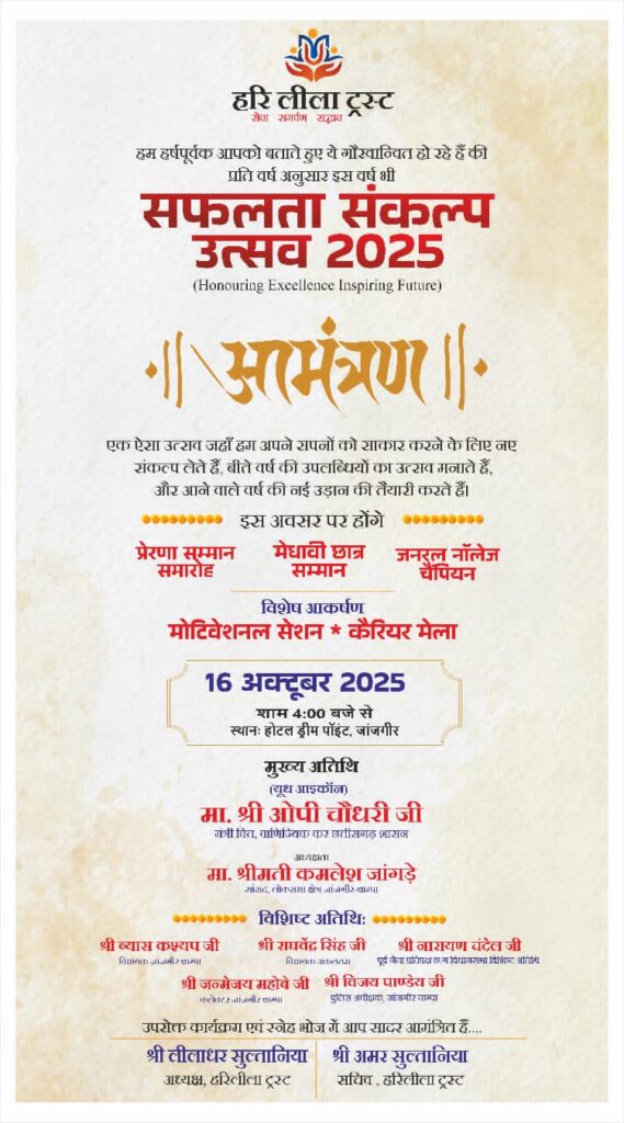 जांजगीर। हरि लीला ट्रस्ट, बनारी (जांजगीर-नैला) द्वारा आयोजित “सफलता संकल्प उत्सव 2025” का भव्य आयोजन आगामी 16 अक्टूबर (गुरुवार) को होटल ड्रीम पॉइंट, जांजगीर में अपराह्न 4 बजे से किया जाएगा।