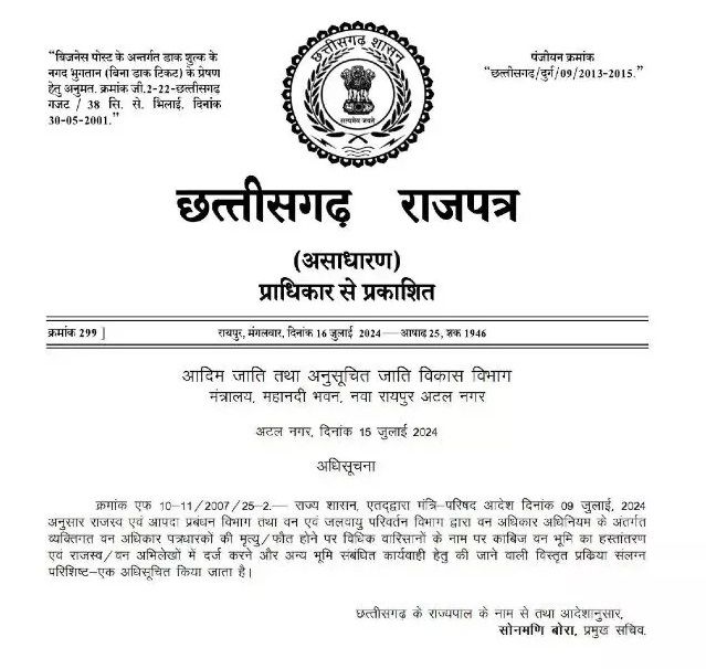 रायपुर । वनाधिकार पट्टाधारियों की मौत के बाद उनके वारिसानों को काबिज भूमि के हस्तांतरण संबंधी प्रक्रिया राज्य सरकार ने तय कर दी है। पिछले दिनों मुख्यमंत्री विष्णुदेव साय की अध्यक्षता में हुई राज्य मंत्रिपरिषद की बैठक में इस संबंध में नीतिगत निर्णय लिया गया था। इस सरकार ने क्रियान्वयन करते हुए प्रक्रिया तय की है। विधिक वारिसान द्वारा काबिज वन भूमि जिस विभाग के अभिलेखों में दर्ज है, उसके आधार पर आवेदन संबंधित विभाग के अधिकारी तहसीलदार (राजस्व विभाग) या रेंज ऑफिसर (वन विभाग को प्रस्तुत किया जाएगा। इसके बाद संबंधित विभागीय अधिकारी द्वारा आगे की कार्यवाही तय की जाएगी।