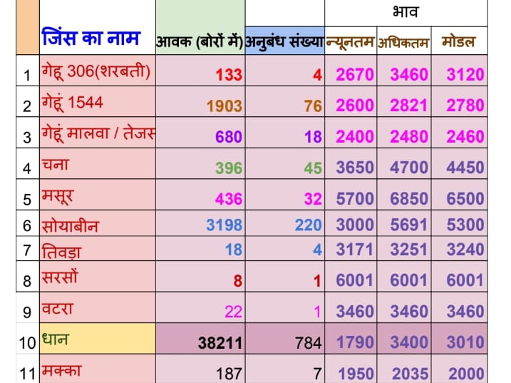 - मालवा शक्ति गेहूं- न्यूनतम 2400 रुपए और उच्चतम 2480 रुपए क्विंटल बिका।