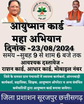 सूरजपुर । जिल प्रशासन की ओर से 23 अगस्त को आयुष्मान कार्ड को लेकर समस्त ग्राम पंचायतों मे महाअभियान चलाया जाएगा। इस महाअभियान के अंतर्गत जिले के 471 ग्राम पंचायतों में स्वास्थ्य कार्यकर्ता, आंगनबाड़ी कार्यकर्ता, सहायिका, शिक्षक, आयुष्मान ऑपरेटर व अन्य संबंधित कर्मचारियों द्वारा 23 अगस्त को सुबह 09 बजे से शाम 06 बजेे तक आयुष्मान कार्ड बनाया जाएगा। नवीन आयुष्मान कार्ड व संशोधन हेतु हितग्राही राशन कार्ड, आधार कार्ड, मोबाइल नंबर व वांछित आवश्यक दस्तावेज के साथ उपस्थित होवें।