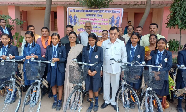 कोरबा 21 नवंबर 2025. स्वामी आत्मानंद शासकीय उत्कृष्ठ हिंदी माध्यम विद्यालय, कन्या साडा में शुक्रवार को सरस्वती साइकिल योजना के तहत 177 छात्राओं को साइकिल वितरित की गई। कार्यक्रम में मुख्य अतिथि के रूप में प्रदेश के कैबिनेट मंत्री श्री लखन लाल देवांगन तथा विशिष्ट अतिथि के रूप में कोरबा नगर निगम की महापौर श्रीमती संजू देवी राजपूत उपस्थित रहीं। माँ सरस्वती की पूजा कर दीप प्रवजलित किया गया अतिथियों का स्वागत विद्यालय प्रबंधन ने पुष्पगुच्छ देकर किया। कैबिनेट मंत्री श्री लखन लाल देवांगन जी और कोरबा महापौर श्रीमती संजू देवी राजपूत जी ने बच्चों को तिलक लगाकर मूंग मिठाई के खिलाकर साइकिल वितरण किया.
