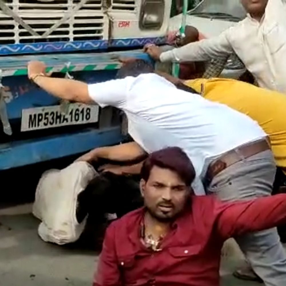 ट्रक के नीचे फंसे युवक को बाहर निकालते लोग।