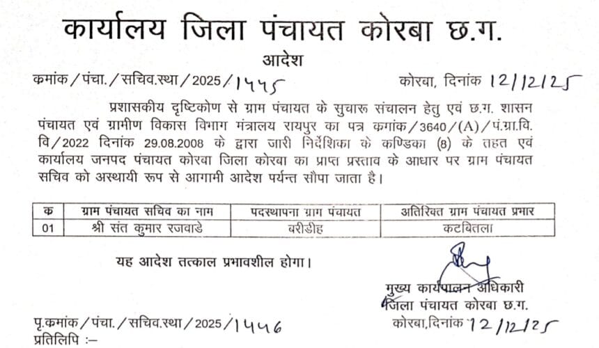 गौरतलब है कि 12 दिसंबर 2025 को जिला पंचायत सीईओ दिनेश कुमार नाग ने प्रशासनिक दृष्टिकोण से ग्राम पंचायतों के सुचारू संचालन हेतु आदेश जारी किया था। यह आदेश छत्तीसगढ़ शासन पंचायत एवं ग्रामीण विकास विभाग मंत्रालय, रायपुर के पत्र क्रमांक 3640/(A)/पं.ग्रा.वि./2022 दिनांक 29.08.2008 द्वारा जारी निर्देशिका की कंडिका (8) के तहत तथा जनपद पंचायत कोरबा से प्राप्त प्रस्ताव के आधार पर पारित किया गया था।