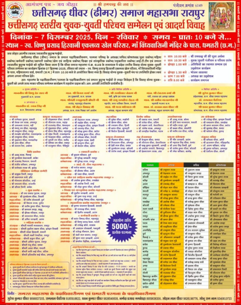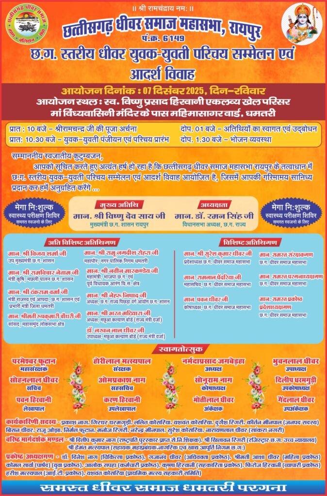 आरंग,1दिसंबर 2025/ छत्तीसगढ़ प्रदेश स्तरीय धीवर समाज का विवाह योग्य युवक युवती परिचय सम्मेलन का आयोजन 7 दिसम्बर दिन रविवार को सुबह 10 बजे धमतरी के आयोजन स्थल स्व. विष्णु प्रसाद हिरवानी एकलव्य खेल परिसर में आयोजित किया गया है। इस प्रदेश स्तरीय विवाह योग्य युवक-युवती परिचय सम्मेलन में पूरे छत्तीसगढ़ के स्वजातीय विवाह योग्य युवक व युवती अपने पालक के साथ उपस्थित होकर भाग ले सकते हैं।