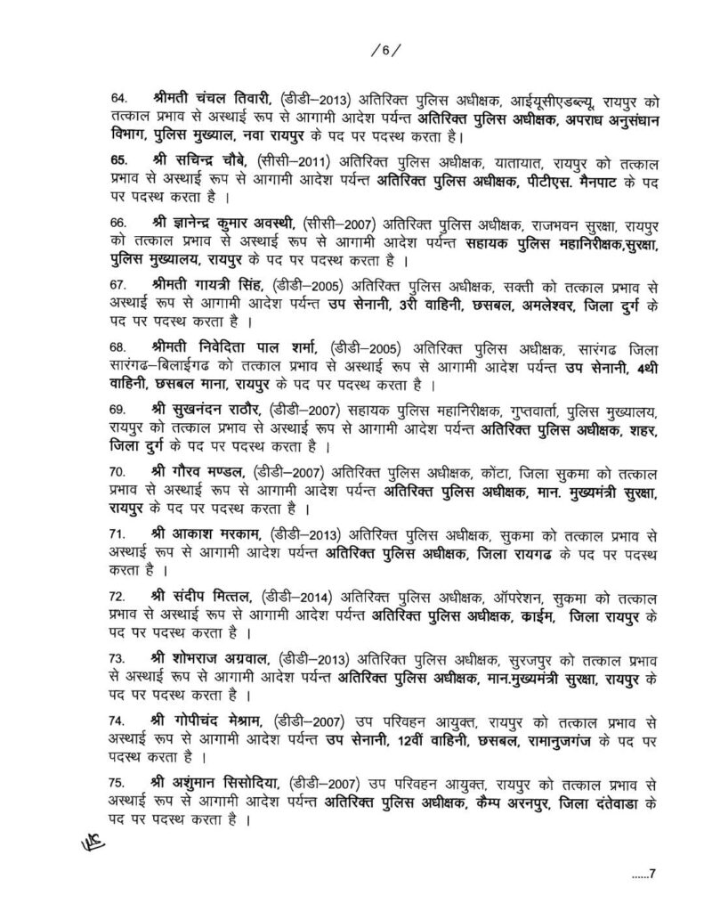 रायपुर I छत्तीसगढ़ में लगातार कई विभागों में अधिकारियों के तबादले का आदेश जारी हो रहा है। इसी बीच एक बार फिर पुलिस महकमें में बड़े पैमाने पर ट्रांसफर हुआ है। एक साथ 76 अधिकारियों का तबादला हुआ है। इस बाबात में गृह विभाग ने आदेश जारी किया है।