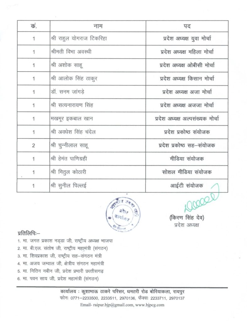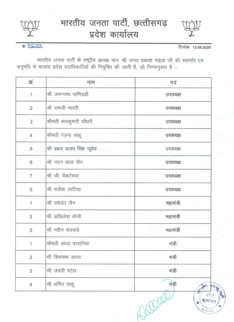 CG BREAKING: भाजपा की प्रदेश कार्यकारिणी घोषित, प्रदेश पदाधिकारियों की हुई नियुक्ति, देखिये पूरी लिस्ट…