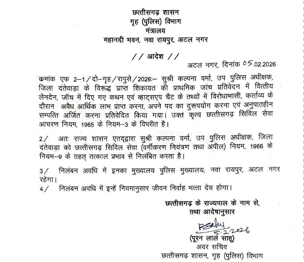 निलंबन अवधि में उन्हें नियमानुसार जीवन निर्वाह भत्ता देय होगा। यह आदेश छत्तीसगढ़ के राज्यपाल के नाम से जारी किया गया है।