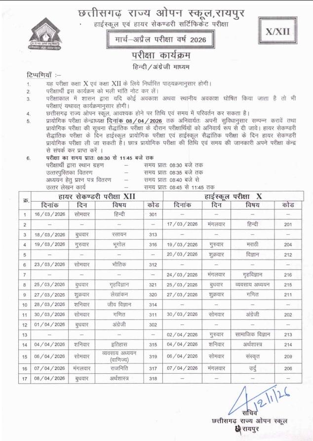 रायपुर। छत्तीसगढ़ राज्य ओपन स्कूल, रायपुर ने हाईस्कूल (कक्षा 10वीं) और हायर सेकेंडरी (कक्षा 12वीं) सर्टिफिकेट परीक्षा 2026 की समय-सारिणी घोषित कर दी है। परीक्षाएं मार्च से अप्रैल 2026 के बीच आयोजित की जाएंगी। घोषित कार्यक्रम के अनुसार हायर सेकेंडरी परीक्षा 16 मार्च 2026 से शुरू होकर 8 अप्रैल 2026 तक चलेगी, जबकि हाईस्कूल परीक्षा 17 मार्च 2026 से प्रारंभ होकर 7 अप्रैल 2026 तक आयोजित की जाएगी। दोनों परीक्षाओं का समय सुबह 8.30 बजे से 11.45 बजे तक निर्धारित किया गया है।