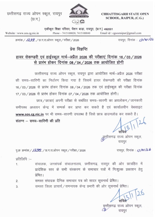 CG Open School Exam 2026 : छत्तीसगढ़ राज्य ओपन स्कूल की 10वीं–12वीं परीक्षा 2026 की समय-सारिणी जारी