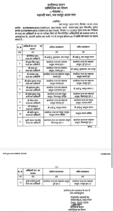 CG Transfer Breaking: वाणिज्यिक कर विभाग में बड़ा फेरबदल, 12 अधिकारियों के तबादले, यहां देखें सूची
