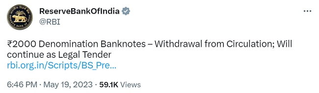 आरबीआई ने बैकों को सलाह दी है कि वे तत्काल प्रभाव से 2000 रुपये के नोट जारी बंद करें। बाजार में मौजूद नोटों को बैंकों में जमा कराया जा सकता है या फिर 30 सितंबर, 2023 तक बदला जा सकता है।आरबीआई के मुताबिक, 2000 रुपये के नोटों को 23 मई से लेकर 30 सितंबर तक 20,000 रुपये तक एकबार में बदलवाए जा सकते हैं।