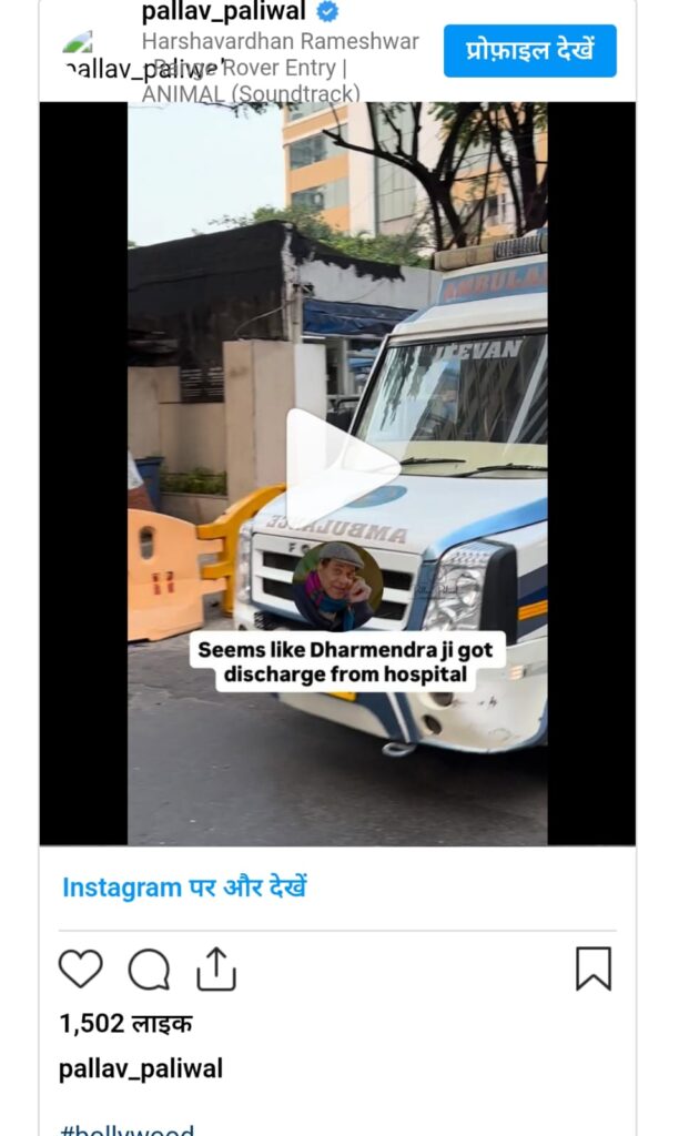बीती रात बॉबी देओल, सनी देओल और धर्मेंद्र के पोतों (करण और राजवीर) को हॉस्पिटल से वापस लौटते देखा गया था। उनके चेहरों के हावभाव फैंस की चिंता और भी ज्यादा बढ़ा रहे थे। लेकिन इस बीच एक्टर को हॉस्पिटल से डिसचार्ज किया जाना उनके फैंस के लिए राहत की खबर हो सकती है। धर्मेंद्र के कुछ वीडियो सोशल मीडिया पर वायरल हैं जिनमें एक एम्बुलेंस को ब्रीच कैंडी हॉस्पिटल से बाहर आते देखा जा सकता है। बॉलीवुड के ही-मैन कहे जाने वाले धर्मेंद्र का भारतीय सिनेमा जगत में योगदान अद्वितीय रहा है।
