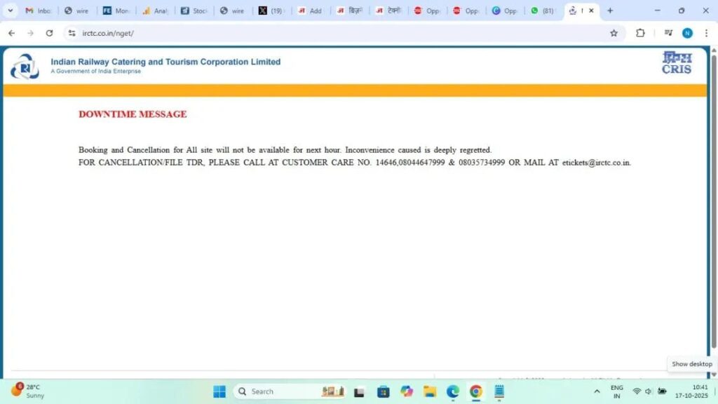 IRCTC की वेबसाइट पर लिखे नोटिफिकेशन के मुताबिक, अगले एक घंटे तक सभी साइटों के लिए बुकिंग और कैंसिलेशन उपलब्ध नहीं होगा। कैंसिलेशन या टीडीआर फाइल करने के लिए 08044647999 और 08035734999 पर कॉल करने या etickets@rcte.co.in पर ईमेल करने की लिए कहा गया है।’